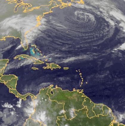 Südöstlich von Neuschottland befindet sich der Kern eines gut ausgeprägten Tiefs. Hierbei ist die Zirkulation entgegen dem Uhrzeigersinn an der Wolkenstruktur erkennbar.