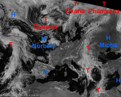 Auf dem Satellitenfoto von Europa waren um 12 UTC gleich 3 Tiefdrucksysteme über dem nördlichen Europa zu sehen. In einem breiten Streifen von Schottland, über die Nordsee bis nach Skandinavien und weiter nach Nordwestrussland sind bei teils dichten Wolken immer wieder Schauer möglich. Deutlich freundlicher und größtenteils trocken ist es von West- über Mittel- bis nach Osteuropa, wobei eine Tiefdruckbrücke von Polen bis ins östliche Mittelmeer für teils dichte Wolken und mögliche Schauer sorgt. Sonst ist es auch im Mittelmeerraum überwiegend freundlich und trocken, einzelne Schauer sind aber vor allem von Süditalien bis nach Griechenland möglich.