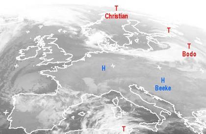 Auf dem heutigen Satellitenfoto zeigt sich ein kräftiges Tiefdrucksystem im Bereich des zentralen Mittelmeers. Hierbei kann es vom spanischen Festland, über die Balearen, Italien bis an die Westküste der Türkei zu häufigen Schauer, teils auch zu Gewittern, kommen. Ebenso recht wechselhaft mit zeitweiligen Regen- oder Schneefällen ist es von Skandinavien bis weit ins russische Binnenland, wobei hier die Niederschläge überwiegend als Schnee fallen. Vielfach sonniges und trockenes Winterwetter herrscht dagegen unter Hochdruckeinfluss von den Britischen Inseln, über Frankreich, Deutschland bis in den Südosten Europas.