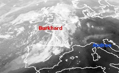 Mitteleuropa befindet sich noch weitgehend unter dem Einfluss von Hoch 'Andrea' über Norditalien. Dabei werden in Deutschland heute unter Zufuhr schwül-warmer Luft aus dem Südwesten teilweise fast 40 Grad erreicht. Über Großbritannien liegen aber schon die Fronten von Tief 'Burkhard' bereit, das mit Schauern und Gewittern heute Abend und in der Nacht auch Deutschland erreicht. (Bildquelle: http://www.sat.dundee.ac.uk)