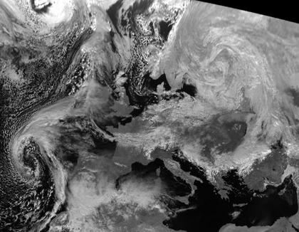 Deutlich ist auf dem Satellitenbild von Europa das ehemalige Orkantief 'Xynthia' zu sehen, das sich, erheblich abgeschwächt, mit seinem Zentrum über dem Finnischen Meerbusen befindet. Weite Teile Mitteleuropas befinden sich im Einflussbereich von Hoch 'Harro', dessen Kern über der Nordsee liegt. Vor der Iberischen Halbinsel ist ein gut ausgeprägtes Tief mit der typischen Wolkenstruktur des Warmluft- und des Kaltluftbereichs zu sehen.