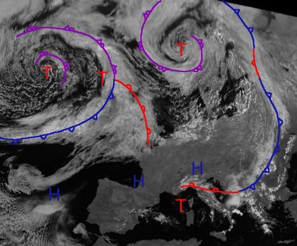 Hoch 'Nicole' liegt heute über den Alpen und sorgt für wolkenarmes und sonniges Wetter von Südpolen bis nach Südwesteuropa. Sonst bestimmen Tiefdruckgebiete mit vielen Wolken das Satellitenbild. Tief 'Giselher' über Skandinavien und Tief 'Heiko' bei Island sorgen für Wolken, Schauer und Gewitter über Nord-, Ost- und Südosteuropa. Hoch 'Nicole' zieht in den kommenden Tagen nach Osten weiter, dann übernimmt Tief 'Heiko' von Westen das Wettergeschehen in Mitteleuropa und auch in Deutschland.