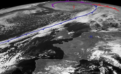 Hoch 'Fody' über Norddeutschland sorgt über West- und Europa für wolkenarmes Wetter. Östlich von Island befindet sich dagegen das Tief 'Pelagia'. Es bringt Wolken in der Nordwesten von Skandinavien. Zudem verläuft seine langgestreckte Kaltfront über die nördlichen Britischen Inseln weit auf dem Atlantik hinaus. Diese Kaltfront zieht nach Südosten weiter und wird Mitteleuropa morgen Mittag erreichen. Somit schwächt sich der Hochdruckeinfluss allmählich ab und macht damit auch Platz für weitere Tiefausläufer. (Bildquelle: Copyrigt EUMETSAT, NERC Satellite Receiving Station, University of Dundee)