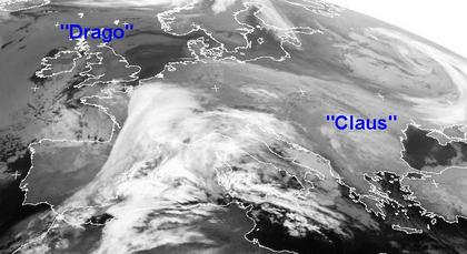 Tiefdruckgebiete über dem westlichen Mittelmeer sorgen für Regen und Schnee von Frankreich und Spanien, sowie bis Italien und Nordafrika. Auch über Russland bringt ein Tief noch Schneefälle. Eine Hochdruckbrücke von Hoch 'Drago' über Schottland und Hoch 'Claus' über Rumänien sorgt für ruhiges, teils aber auch trübes Wetter in Teilen von Nord- und Osteuropa.