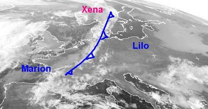 Während es in Mittel- und Osteuropa unter Hochdruckeinfluss weiter freundlich und wolkenarm bleibt, sorgen atlantische Tiefausläufer für Wolken und Schauer in Westeuropa. Von Skandinavien über Westdeutschland bis nach Frankreich erstreckt sich die Kaltfront des Tiefs „Xena“, sie schwächt sich im Laufe des Tages ab und bringt nur ein wenig Regen.