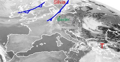 Die Kaltfront von Tief „Silvia“ mit Zentrum über Skandinavien liegt am Samstag Vormittag genau über Deutschland. Auf der Rückseite des Tiefs haben sich in feucht-kalter Luft mehrere Schauerwolken entwickelt, auf dem Satellitenbild erkennt man sie über Schottland und dem Atlantik. Von der Iberischen Halbinsel bis nach Frankreich und Italien sorgt ein Zwischenhoch für wolkenarmen Himmel. (Bildquelle: NERC Satellite Receiving Station, Dundee University, Scotland, http://www.sat.dundee.ac.uk/)