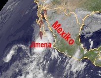 Auf dem heutigen Satellitenbild von Mittelamerika zeigt sich Hurrikan 'Jimena' direkt vor der Westküste Mexikos. Er weist derzeit seine voraussichtlich höchsten mittleren Windgeschwindigkeiten von 250 km/h auf, womit er die höchste Stufe 5 der Hurrikanskala erreicht hat. In einigen Küstenbereichen Mexikos kann es zu erheblichen Niederschlägen kommen. Auf seinen weiteren Weg nach Norden über die Halbinsel Niederkalifornien, schwächt sich der Wirbelsturm voraussichtlich zunächst langsam und ab morgen spürbar ab.