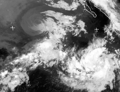 Auf diesem Bild kann man einen Tropensturm zu Beginn seiner Karriere sehen und direkt daneben einen Hurrikan in Auflösung. Während Ex-Hurrikan 'Carlotta' über dem freien Pazifik zwar noch als Wirbel erkennbar ist, haben sich die hohen, hellen Wolken schon größtenteils aufgelöst. Das bedeutet, dass dem Sturm der Treibstoff ausgeht: von der Meeresoberfläche kommt nicht mehr genügend Energie in Form von Wasserdampf, um den hohen Wolkenwall und den gesamten Sturm am Leben zu erhalten. Ganz anders ist es bei dem werdenden Hurrikan '05E', er hat noch keinen Namen bekommen. Deutlich sind die hohen und energiereichen Gewitterwolken zu erkennen, die sich allmählich zu einem Wolkenwirbel zusammenfinden. Auch wenn zurzeit des Bildes noch keine besonders hohen Windgeschwindigkeiten erreicht wurden, ist die Situation hier deutlich gefährlicher. In den nächsten Tagen wird sich aus diesem Wirbel voraussichtlich ein ausgewachsener Hurrikan entwickeln.