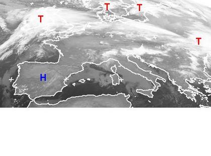 Zwischen einem Hoch über der Iberischen Halbinsel und Tiefdruckgebieten im Norden und Nordosten verläuft eine Luftmassengrenze, die feuchte und kühle Luft in Norden von trockener und milder Luft im Süden trennt. Diese Luftmassengrenze ist als Wolkenband zwischen einem Tief über Großbritannien und einem weiteren Tief über der Ukraine gut zu erkennen. Dabei kommt es zu teils ergiebigen Niederschlägen. (Bildquelle: NERC Satellite Receiving Station, Dundee University, Scotland, http://www.sat.dundee.ac.uk/)