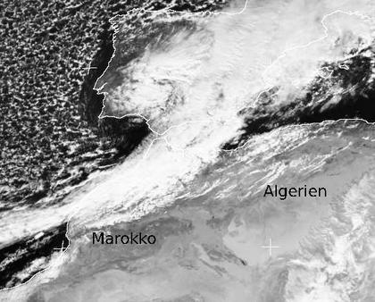Die Kaltfront der Tiefs 'Xevera' über Norwegen, die sich heute Mittag vom Baltikum quer über Europa erstreckt, hat auch den Nordwesten von Afrika erfasst. Dabei kommt es in Algerien und Marokko zu Regenfällen oder Schauern. Auch über Spanien regnet es im Frontbereich häufig. Über dem Atlantik zeigen sich dagegen Schauerzellen. Die Front bleibt nun am Atlas hängen und zieht kaum noch weiter ins Landesinnere. (Bildquelle: Copyrigt EUMETSAT, NERC Satellite Receiving Station, University of Dundee)
