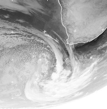 Ein Tief liegt südlich von Südafrika. Seine Kaltfront zieht morgen mit Regen über das Kapland hinweg. Auf ihrer Rückseite ist jetzt schon das lockere Muster der folgenden Kaltfrontbewölkung zu erkennen. Dabei kommt es vor allem an der Küste auch zu Sturm. Weiter nach Norden bleibt aber das meist wolkenlose Wetter erhalten.
