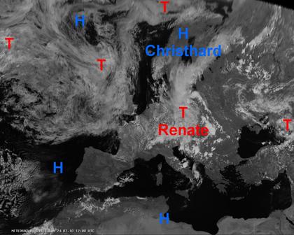 Auf dem heutigen Satellitenbild zeigt sich ein ausgeprägtes Tiefdruckgebiet mit Zentrum über Polen, sein Einfluss reicht von der Schweiz im Südwesten bis in die Ostsee im Nordosten, sowie von der Südosthälfte Deutschlands bis zur Adria im Südosten. In diesen Gebieten sind vielfach kräftige Regenfälle und teils Gewitter zu erwarten. Sonst herrscht in Europa aber überwiegend Hochdruckeinfluss mit häufig freundlichem Wetter.
