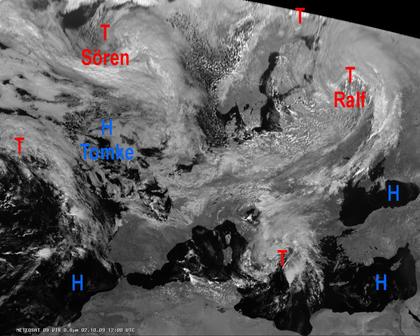 Auf dem Satellitenbild von heute Nachmittag zeigen sich Tiefdruckgebiete über dem zentralen Mittelmeer und im westlichen Russland. Hierbei kommt es von Italien über die Ägäis bis in den Westen Griechenlands zu teils kräftigen Schauern oder Gewittern. Über dem Nordmeer hat sich ein kräftigen Sturmtief gebildet, das heute dem Westen Skandinaviens und Großbritanien häufig Regen oder teils kräftige Schauer brachte. Deutlich freundlicher und weitgehend trocken ist es sowohl in Südwest- als auch in Südosteuropa.
