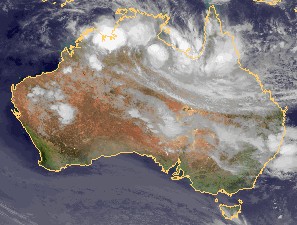 Das Satellitenfoto zeigt die Südhälfte Australiens überwiegend heiter oder wolkenlos. Hier wird es vielfach auch heiss. Im Norden des Kontinents ziehen mehrere kräftige Tiefdrucksysteme mit vielfach kräftigem Regen und Wind übers Land. Auch sonst ist es im Norden häufig wolkig, aber zum größten Teil auch trocken.