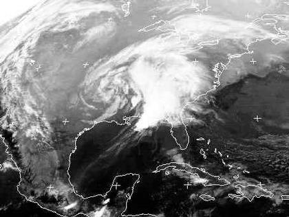Ein Tief verlagert sich vom Mittleren Westen der USA ostwärts in Richtung Atlantikküste, auf dem Satellitenbild erkennt man sehr gut Wolken seines Frontensystems: die Warmfront erstreckt sich von den Großen Seen bis zur Atlantikküste, die Kaltfront liegt westlich der Appalachen; vor allem in Alabama, Georgia, Südcarolina und Florida bringt sie kräftigen und ergiebigen Regen.