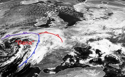 Das europäische Festland zeigt sich am Mittwoch Mittag häufig unter dichten Wolken. Auf der Rückseite der Tiefs 'Carmelita' über Russland zieht von Deutschland bis nach Polen und Skandinavien meist dichte Bewölkung durch und es kommt auch zu Regen und Schauern. Richtung Frankreich und Britische Inseln herrscht leichter Zwischenhocheinfluss mit lockerer Bewölkung, von Südwesten kommt aber bereits Tief 'Dana' mit vielen Wolken und Regen hinterher, morgen überquert es dann auch Deutschland. (Bildquelle: NERC Satellite Receiving Station, Dundee University, Scotland, http://www.sat.dundee.ac.uk/)