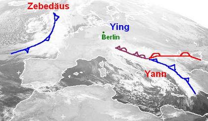 Tief „Yann“ mit Zentrum über Griechenland bringt weiterhin zum Teil kräftige Regenfälle in Südosteuropa, die zum teil von scheren Gewittern begleitet werden. Es verlagert sich langsam nach Osten zu dem Schwarzen Meer und der Türkei. Ein weiteres Tief mit dem Namen „Zebedäus“ liegt westlich von Skandinavien, seine Kaltfront erstreckt sich vom Zentrum des Tiefs über Großbritannien bis zum Golf von Biskaya. Von der Iberischen Halbinsel bis nach Mitteleuropa überwiegt Hochdruckeinfluss mit ruhigem Wetter, einigeHochnebelfelder sind über Deutschland und Polen zu erkennen. (Bildquelle: NERC Satellite Receiving Station, Dundee University, Scotland, http://www.sat.dundee.ac.uk/)