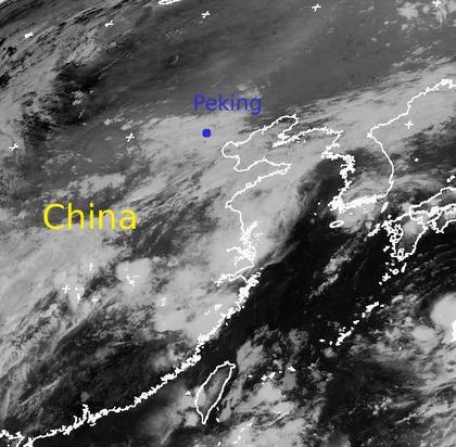 Über Peking und seine Umgebung, wo derzeit die Olympischen Spiele stattfinden, liegen am Donnerstag einige Wolken, teils in Form von Zellen. Sie bringen teils kräftigen Regen, sodass einige Wettbewerbe sogar ausfallen mussten. Damit kann man den Versuch der Chinesen, das Wetter mit Beschuss der Wolken durch Silberjodid zu beeinflussen, wohl als gescheitert betrachten. (Bildquelle: Copyrigt EUMETSAT, NERC Satellite Receiving Station, University of Dundee)
