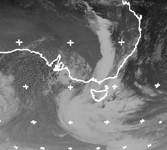 Im Süden Australiens bringen viel Wolken Regen und Kälte. Ein Teil des Wolkenbandes reicht dabei weit in das Hinterland hinein und sorgt auch hier für Niederschlag. Ansonsten ist es in Australien meist wolkenfrei, so dass es trocken bleibt. (Quelle: http://www.sat.dundee.ac.uk)