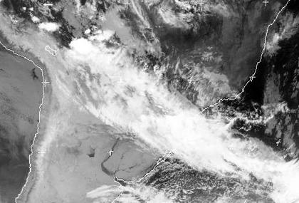 Von Bolivien über Südbrasilien bis weit auf den Atlantik sorgt ein Tiefdruckgebiet mit seiner Kaltfront für teils ergiebige Regenmengen. In Nordargentien ist es hinter der Front dagegen bereits wieder trocken. (Bildquelle: NERC Satellite Receiving Station, Dundee University, Scotland, http://www.sat.dundee.ac.uk/)