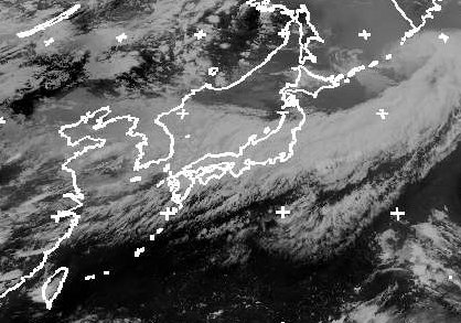 Im Bereich der Kaltfront eines Tiefs östlich der Kurilen erkennt man ein Wolkenband, das sich über die Südhälfte Japans bis in das Gelbe Meer erstreckt. In schwülwarmer Luft kommt es hier zu kräftigem und teils gewittrigem Regen. Nur sehr langsam zieht das Wolkenband südwärts auf den Ozean hinaus. (Bildquelle: NERC Satellite Receiving Station, Dundee University, Scotland, http://www.sat.dundee.ac.uk/)