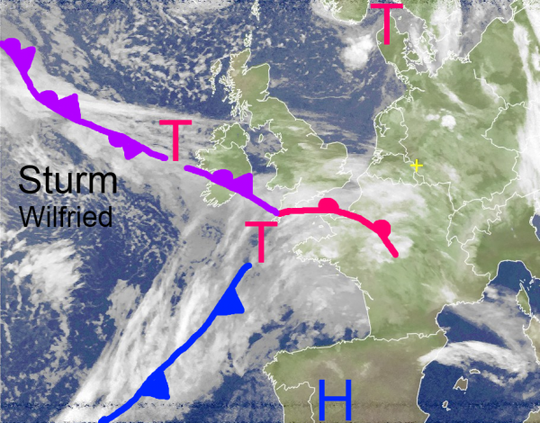 Das Satellitenfoto von heute zeigt uns das Frontensystem eines Randtiefs westlich von Frankreich, das mittlerweile schon mit Dauerregen auf den Südwesten übergegriffen hat. Im Schwarzwald können bis morgen über 20 Liter / m² Niederschlag fallen. Am Abend und in der Nacht kann es hier bereits schon zu schweren Sturmböen kommen.