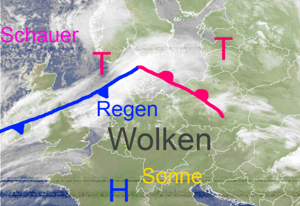 Die über der Nordsee liegende Kaltfront dringt mit ihren Regenwolken weiter ins Landesinnere vor und erreicht im Laufe der Nacht auch das nördliche Baden-Württemberg und Bayern. Hinter ihr strömt kühlere und trockenere Luft nach Deutschland, so dass die Wolkendecke morgen häufiger mal auflockern kann.