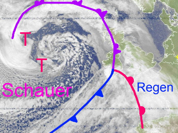 Nach zwei freundlichen und trockenen Wintertagen müssen wir jetzt wieder den Blick auf den Atlantik richten. Hier hat sich nämlich ein klassischer Wolkenwirbel formiert, der uns morgen allerdings in abgeschwächter Form erreichen wird. Vor allem im Westen drohen zunächst Schnee und stellenweise auch gefrierender Regen, bevor sich dann etwas mildere Luft durchsetzt.