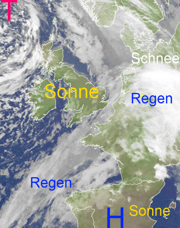 Ein Tiefausläufer brachte vor allem der Westhälfte gebietsweise Schnee, örtlich auch gefrierenden Regen. Mittlerweile ist die Front unter Abschwächung auch in den Osten vorgedrungen, allerdings haben die Wolken kaum noch Niederschlag im Gepäck. Die etwas mildere Luft sorgt im Westen teilweise für neblig-trübes Wetter mit etwas Regen oder Sprühregen.