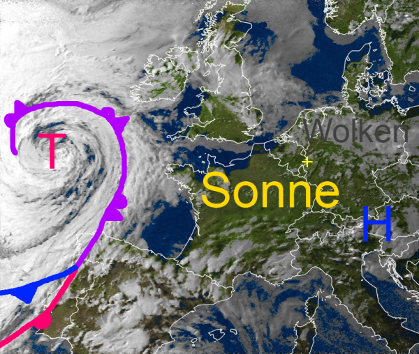 Über dem Atlantik hat sich in den letzten beiden Tagen ein klassischer Wolkenwirbel gebildet, der zu einem kleinen aber intensiven Tiefdruckgebiet gehört. Dieses Tief wandert zu Wochenbeginn allmählich nach Frankreich und löst hier hohe Labilität aus, die im weiteren Verlauf vor allem im Süden und Westen von Deutschland auch wieder zu teils kräftigen Regengüssen und Gewittern führen kann. Zuvor geht es mit den Temperaturen aber wieder bergauf.