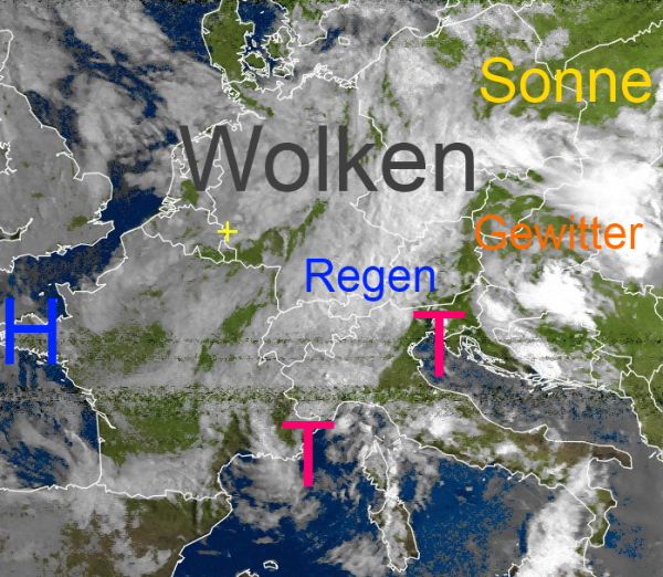 Mit der nördlichen Strömung hat sich an den Alpen eine Staulage gebildet. Die Wolken werden gegen die Berge gedrückt und sozusagen wie ein Schwamm ausgepresst. In Folgedessen fällt ergiebiger Regen der zu Überschwemmungen führen kann. Im übrigen Bereich von Deutschland dominieren zwar auch die Wolken, Regen fällt jedoch kaum noch. Nur stellenweise blinzelt die Sonne hervor.