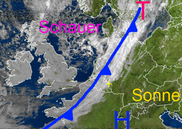 Die Kaltfront des Tiefs über Südschweden überquert Deutschland mit ihrer Wolkenzone von Nordwest nach Südost. Vor allem in Norddeutschland fällt dabei gelegentlich Regen. Von der Nordsee rücken weitere Schauer und Gewitter nach. Im Vergleich zum Vortag ist es empfindlich kühler geworden.