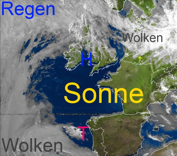Das Hoch bei den Britischen - Inseln hat für ein großes Sonnenfenster über Südwesteuropa gesorgt. Über Frankreich, Spanien und dem östlichen Atlantik lacht die Sonne von einem nahezu wolkenlosen Himmel.