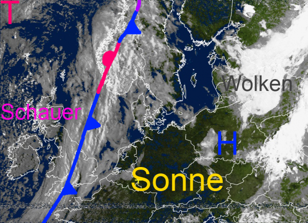 Morgen überquert uns die Störungsfront von Westen und löst gebietsweise teils gewittrige Regengüsse aus. Dabei kühlt die Luft vorübergehend ab.