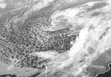 Die Kaltfront des Tiefs 'Thommy' mit seinem Zentrum über den Britischen Inseln erstrecket sich von Südengland über die Bretagne bis in die Biskaya. Hinter der Front bilden sich in einer labilen Luftmasse vermehrt Schauer, die sich vom Englischen Kanal bis westlich von Irland erstrecken.