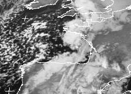 Das Wolkenband, das sich von Portugal über Nordspanien bis nach England erstreckt bildet die Kaltfront des Tiefs 'Rolf' mit Zentrum über Südengland. Auf seiner Rückseite strömt kalte Meeresluft nach Süden, in der sich hohe Schauerwolken bilden.
