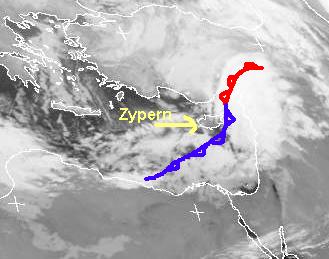 Auf dem Satellitenbild von Samstag früh sind dichte, hochreichende Wolken über Zypern zu erkennen. Sie gehören zu einem kleinen Tief dass heute, im Laufe des Tages, weiter nach Nordost zieht. Dabei sorgt es vor allem entlang der Ostküste des Mittelmeers von Israel bis Syrien zum Teil kräftige Schauer und Gewitter.