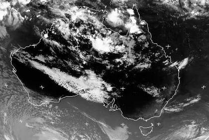 Auf dem Satellitenbild von Montag früh sind Schauer- und Gewitterzellen im Norden von Australien gut zu erkennen. Die Hochreichenden, und damit kalten Wolkenoberkanten (im Infrarotbild weiß dargestellt) heben sich stark vom warmen Erdboden ab (im Infrarotbild schwarz dargestellt).