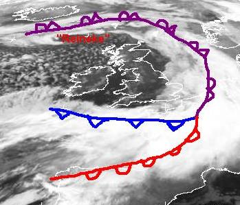 Das Tief 'Reineke' mit deinem Zentrum zwischen Schottland und Island sorgt heute und in den nächsten Tagen für kräftigen Regen und teils stürmischen Wind in weiten Teilen von Nord- und Westeuropa. Auf seiner Rückseite strömen kühlere Luftmassen polaren Ursprungs nach. Zusammen mit dem wärmeren Atlantikwasser bilden sich in einer labilen Schichtung Schauerwolken, die auf dem Satellitenbild westlich von Irland gut zu erkennen sind.
