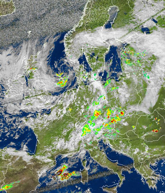 Auf dem Satellitenbild von heute Nachmittag ist es Tiefdruckgebiet über der Nordsee zu erkennen, es sorgt mit seinen Ausläufern für sehr wechselhaftes und kühles Schauerwetter über weiten Teilen der Britischen Inseln, im südlichen Skandinavien, sowie in Nordfrankreich und Benelux.
