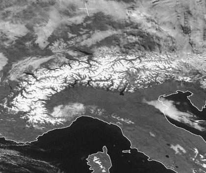 Hoch 'Paolini' liegt heute genau über den Alpen und sorgt dafür, dass sich die meisten Wolken auflösen. Das gibt den Blick frei auf die schneebedeckten Alpen, die hier im Bild deutlich weiß hervortreten. Selbst Täler lassen sich an ihrer helleren Färbung gut zwischen dem ganzen Schnee erkennen und auch größere Seen, wie etwa der Bodensee im Norden oder der Gardasee im Süden, sind durch ihre dunkle Schattierung gut auszumachen. (Bildquelle: Copyrigt EUMETSAT, NERC Satellite Receiving Station, University of Dundee)