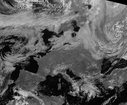 Über Russland ist im Satellitenbild ein ausgeprägtes Tiefdruckgebiet erkennbar, bei dem sehr schön die spiralförmige Struktur und die Drehrichtung entgegen dem Uhrzeigersinn zu sehen ist. Große Teile von Mittel- und Westeuropa sind wolkenfrei, es sind die großen Seen wie der Genfer See, der Bodensee und der Plattensee sichtbar. Über dem westlichen Mittelmeer und Süditalien sowie Griechenland sind umfangreiche Gewitterzellen erkennbar.