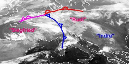 Ein Tiefdrucksystem bringt wechselhaftes Wetter in weiten Teilen von West- und Mitteleuropa. Über der Biscaya ist das Tief 'Siegfried' zu erkennen, seine Kaltfront überquert heute Frankreich von West nach Ost; das kleine Tief 'Rudi' liegt über Deutschland und sorgt hier für viele Wolken mit Regen. Das Hoch 'Indra' hat sich abgeschwächt, es sorgt vor allem auf dem Balkan für wolkenarmen Himmel.