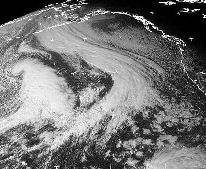 Auf dem Pazifik, südlich der Aleuten, liegt das Zentrum eines Tiefs. Östlich von ihm liegt ein kräftiges Randtief mit einem langgezogenen Wolkenband. Es zieht nach Osten und bringt dann der Küste von British Columbia bis nach Nordkalifornien sehr kräftigen Regen und starken Wind. (Bildquelle: NERC Satellite Receiving Station, Dundee University, Scotland, http://www.sat.dundee.ac.uk/)