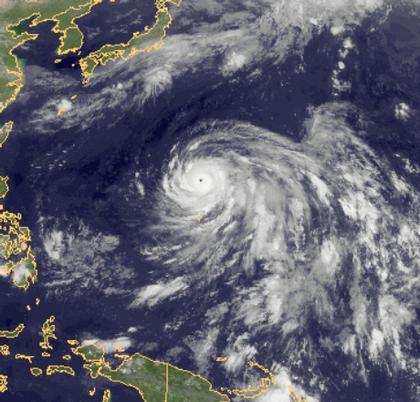 Das Satellitenfoto zeigt den tropischen Wirbelsturm 'Choi-Wan' bei den Nördlichen Marianen, der sich Richtung Japan verlagert. Sehr schön ist das Auge des Taifuns erkennbar, in dem absinkende Luftbewegung für wolkenfreie Gebiete sorgt.