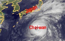Auf dem heutigen Satellitenfilm zeigt sich der Taifun 'Choi-wan' einige 100 Kilometer südöstlich vor Japan. Mit mittleren Windgeschwindigkeiten um 200 km/h und in Böen bis 260 km/h, dreht er zunehmend nach Nordosten ab und schwächt sich gleichzeitig langsam ab. Voraussichtlich in der kommenden Nacht wird sich 'Choi-wan' zu einem tropischen Sturm abschwächen, wobei er selbst dann in Böen noch Windgeschwindigkeiten von 200 km/h erreichen kann.