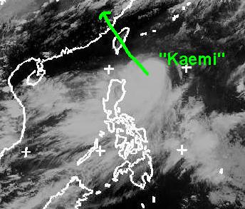 Im Westpazifik nordöstlich der Philippinen befindet sich zur Zeit der Taifun 'Kaemi'. Er erreicht mittlere Windgeschwindigkeiten von 157 km/h, in Böen 195 km/h und zieht langsam in Richtung Nordost. Berechnungen zufolge soll er am Dienstag Taiwan überqueren und sich dabei etwas abschwächen.