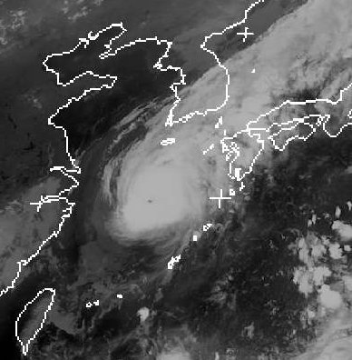 Der Taifun 'Nari' befindet sich am Samstagabend über dem Ostchinesischen Meer westlich von Kyushu. Die Windgeschwindigkeit liegt bei 175 km/h, in Böen auch bis zu 215 km/h. Er zieht nach Norden und erreicht am Sonntag Südkorea. Dabei schwächt er sich bereits etwas ab. Dennoch sind Böen bis 185 km/h zu erwarten. Zudem kommt es zu sehr ergiebigem Regen. (Bildquelle: NERC Satellite Receiving Station, Dundee University, Scotland, http://www.sat.dundee.ac.uk/)