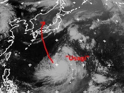 Der tropische Sturm 'Usagi' im Westpazifik, südlich von Japan hat sich zum Taifun verstärkt. Zurzeit erreicht er mittlere Windgeschwindigkeiten von 139, in Böen 167 km/h. Berechnungen zufolge soll er langsam nach Norden ziehen, sich dabei verstärken und am Donnerstag die Insel Shikoku im Südwesten Japans erreichen. Sein Endziel ist allerdings noch unklar. (Bildquelle: NERC Satellite Receiving Station, Dundee University, Scotland, http://www.sat.dundee.ac.uk/)