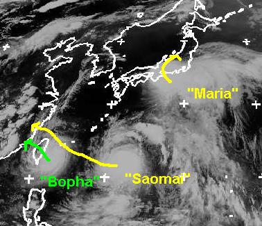 Die drei Wirbelstürme 'Saomai', 'Maria' und 'Bopha' befinden sich noch im Westpazifik zwischen Japan und den Philippinen unterwegs. Am weitesten entwickelt ist zurzeit Taifun 'Saomai'. Seine Windgeschwindigkeit beträgt 140, in Böen 167 km/h. Berechnungen zufolge wird er sich noch weiter verstärken und am Donnerstag die chinesische Küste erreichen. Weiter nördlich ist der Tropensturm 'Maria' unterwegs, mit Böen bis zu 130 km/h und ergiebigem Regen wird er am Dienstag an der Japanischen Küste bei Kioto erwartet. Im Süden liegt der Tropensturm 'Bopha'. Er erreicht zur Zeit in Böen bis zu 120 km/h, soll sich Berechnungen zufolge aber nicht weiter verstärken. Am Mittwoch wird er auf Taiwan erwartet.